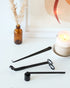 Un trio d'outils pour entretenir vos bougies de la cire à la mèche. L'ensemble comprend un éteignoir, un ciseau coupe-mèche et un grattoir.